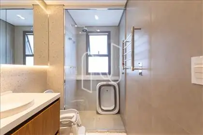 Banheiros com box até o teto, toalheiros térmicos e bancadas em quartzo Mont Blanc